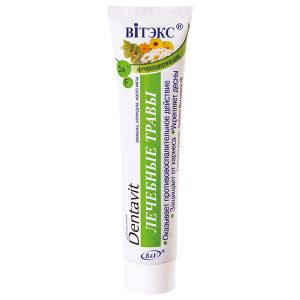 Vitex DENTAVIT Toothpaste Medicinal Herbs 160g Toothpaste Dentavit Medicinal Herbs — natural protection for your teeth Peppermint oil, chamomile and calendula extracts protect against periodontal diseases, strengthen and tone gums, freshen breath; · Active fluorine and calcium strengthen teeth and protect against caries; Natural cleaning base gently and effectively removes plaque. Active ingredients: sodium monofluorophosphate (1000 ppm fluoride mass fraction), chamomile and calendula extracts, mint oil
